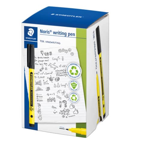 Feinschreiber, Material des Clips: in Schreibfarbe. Der Noris writing pen ist unser neuestes Mitglied in der Noris Familie und dank seiner eindrucksicheren Spitze ein idealer Fineliner für die Schule. Das Gehäuse, d.h. Schaft, Schoner und Abschlusskappe, der Stifte wird aus 97% recyceltem Plastik gemäß ISO 14021 gefertigt.