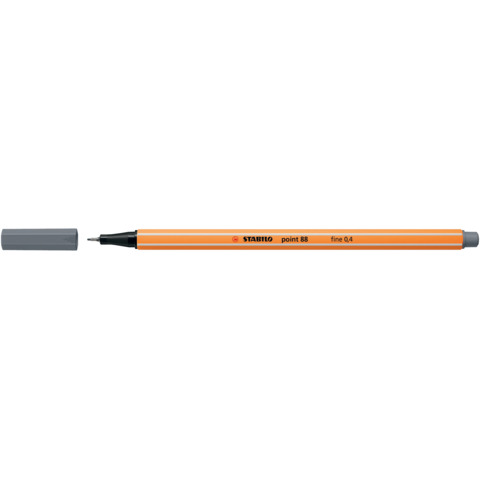 STABILO® point 88®. Der universelle Fineliner für Schüler, Studenten und Profis. Europas Fineliner Nr. 1. Einzigartige Sechskantoptik mit Streifendesign. Typbezeichnung der Mine: Faserspeicher. Ausführung Spitze: metallgefasste Spitze, 0,4 mm, geeignet für Schablone. Art der Schreibflüssigkeit: Tinte auf Wasserbasis, dunkelgrau, lichtbeständig gegeben. Kann einige Tage offen liegen bleiben, ohne einzutrocknen. Kappe am Stiftende aufsteckbar. Ausführung der Griffzone: Kunststoff. Farbe der Kappe: in Schreibfarbe. Farbe des Schaftes: orange mit weißen Kantenstreifen.
