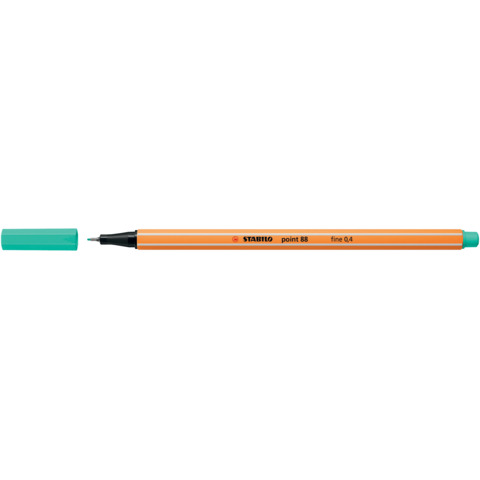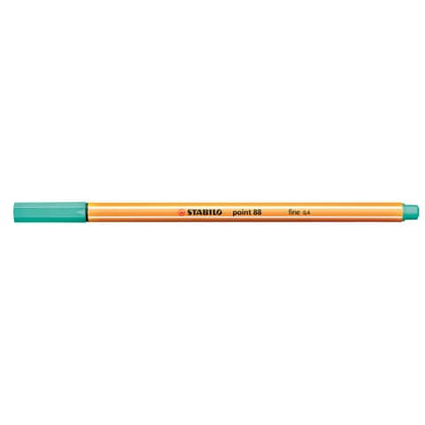 STABILO® point 88®. Der universelle Fineliner für Schüler, Studenten und Profis. Europas Fineliner Nr. 1. Einzigartige Sechskantoptik mit Streifendesign. Typbezeichnung der Mine: Faserspeicher. Ausführung Spitze: metallgefasste Spitze, 0,4 mm, geeignet für Schablone. Art der Schreibflüssigkeit: Tinte auf Wasserbasis, eisgrün, lichtbeständig gegeben. Kann einige Tage offen liegen bleiben, ohne einzutrocknen. Kappe am Stiftende aufsteckbar. Ausführung der Griffzone: Kunststoff. Farbe der Kappe: in Schreibfarbe. Farbe des Schaftes: orange mit weißen Kantenstreifen.