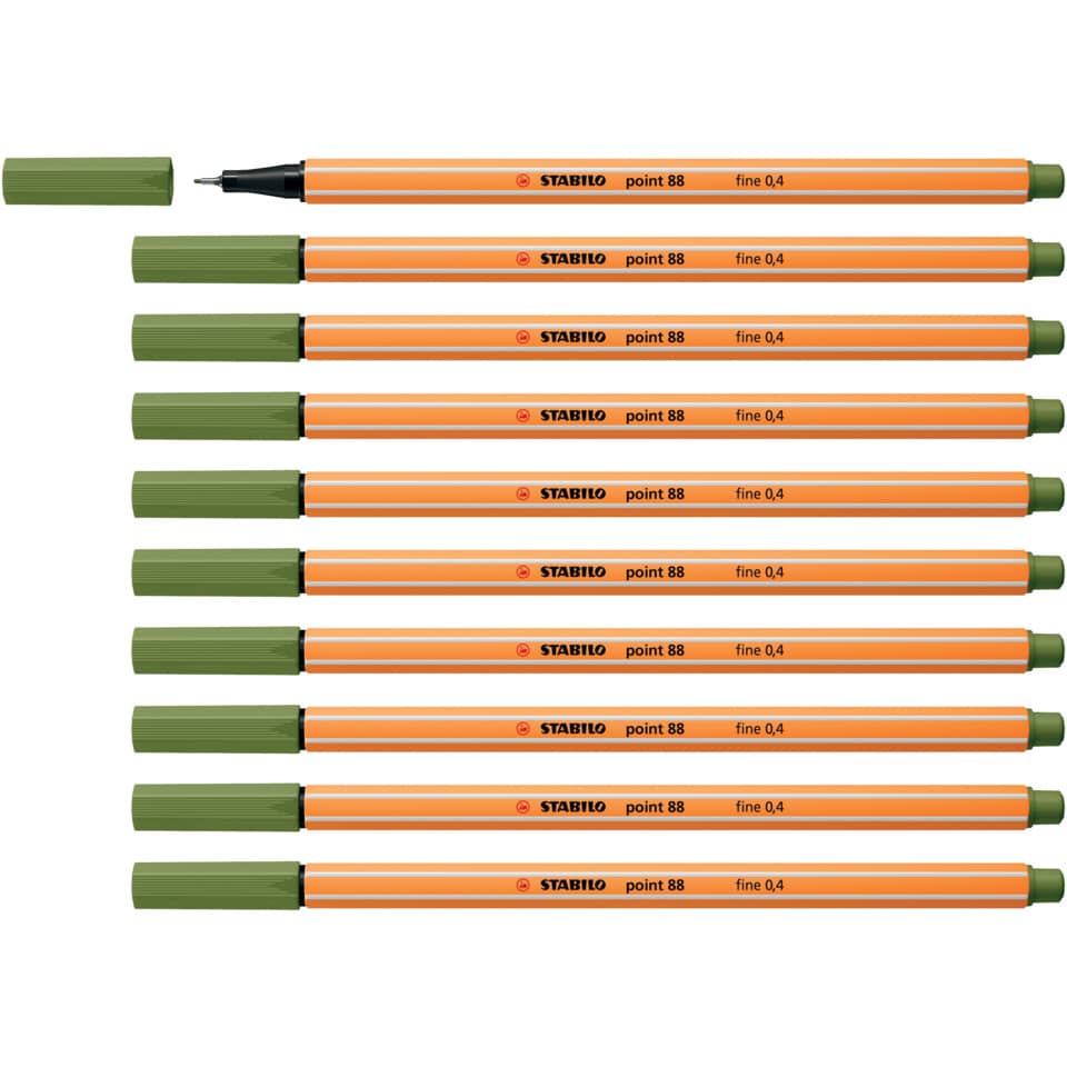 Fineliner STABILO® point 88®, Typbezeichnung der Mine: Faserspeicher, Ausführung Spitze: metallgefasste Spitze, 0,4 mm, geeignet für Schablone, Art der Schreibflüssigkeit: Tinte auf Wasserbasis, moosgrün, lichtbeständig gegeben, kann einige Tage offen liegen bleiben, ohne einzutrocknen, Kappe am Stiftende aufsteckbar, Ausführung der Griffzone: Kunststoff, Farbe der Kappe: in Schreibfarbe, Farbe des Schaftes: orange mit weißen Kantenstreifen
