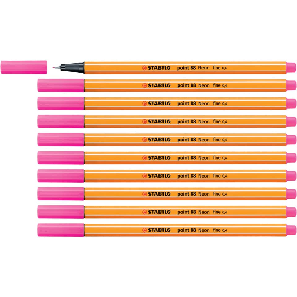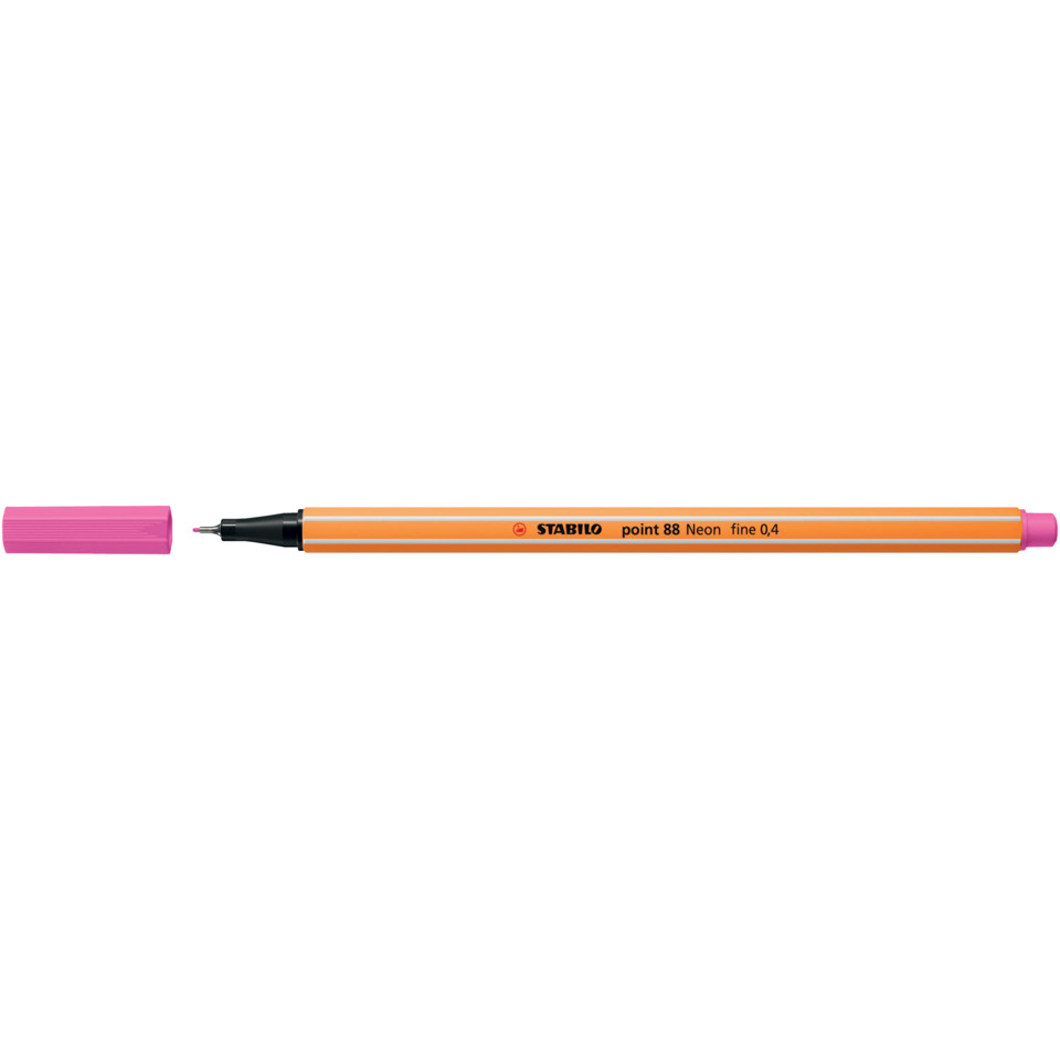 STABILO® point 88®. Der universelle Fineliner für Schüler, Studenten und Profis. Europas Fineliner Nr. 1. Einzigartige Sechskantoptik mit Streifendesign. Typbezeichnung der Mine: Faserspeicher. Ausführung Spitze: metallgefasste Spitze, 0,4 mm, geeignet für Schablone. Art der Schreibflüssigkeit: Tinte auf Wasserbasis, neonrosa, lichtbeständig gegeben. Kann einige Tage offen liegen bleiben, ohne einzutrocknen. Kappe am Stiftende aufsteckbar. Ausführung der Griffzone: Kunststoff. Farbe der Kappe: in Schreibfarbe. Farbe des Schaftes: orange mit weißen Kantenstreifen.