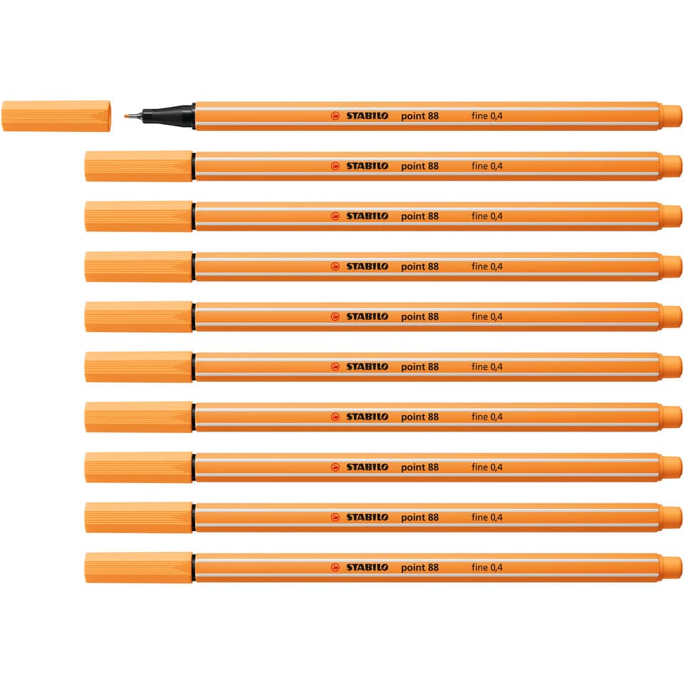Fineliner STABILO® point 88®, Typbezeichnung der Mine: Faserspeicher, Ausführung Spitze: metallgefasste Spitze, 0,4 mm, geeignet für Schablone, Art der Schreibflüssigkeit: Tinte auf Wasserbasis, papaya, lichtbeständig gegeben, kann einige Tage offen liegen bleiben, ohne einzutrocknen, Kappe am Stiftende aufsteckbar, Ausführung der Griffzone: Kunststoff, Farbe der Kappe: in Schreibfarbe, Farbe des Schaftes: orange mit weißen Kantenstreifen