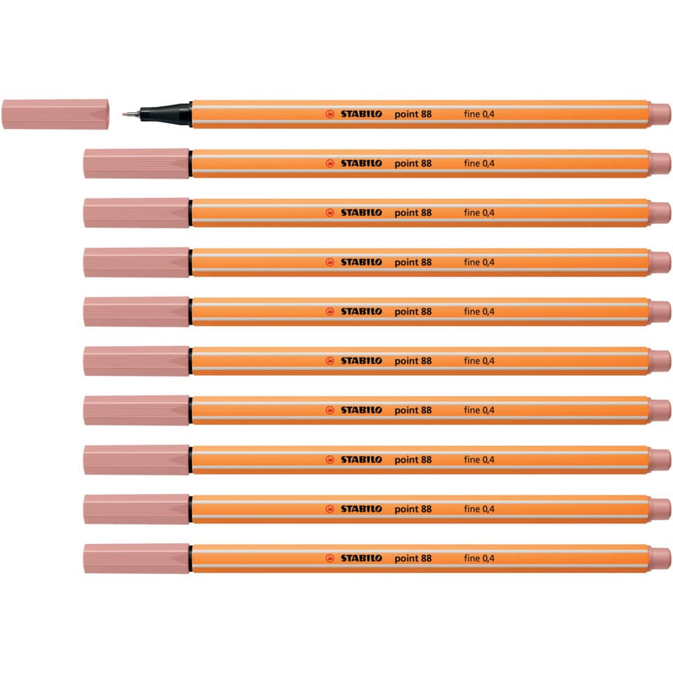 STABILO® point 88®. Der universelle Fineliner für Schüler, Studenten und Profis. Europas Fineliner Nr. 1. Einzigartige Sechskantoptik mit Streifendesign. Typbezeichnung der Mine: Faserspeicher. Ausführung Spitze: metallgefasste Spitze, 0,4 mm, geeignet für Schablone. Art der Schreibflüssigkeit: Tinte auf Wasserbasis, rouge, lichtbeständig gegeben. Kann einige Tage offen liegen bleiben, ohne einzutrocknen. Kappe am Stiftende aufsteckbar. Ausführung der Griffzone: Kunststoff. Farbe der Kappe: in Schreibfarbe. Farbe des Schaftes: orange mit weißen Kantenstreifen.