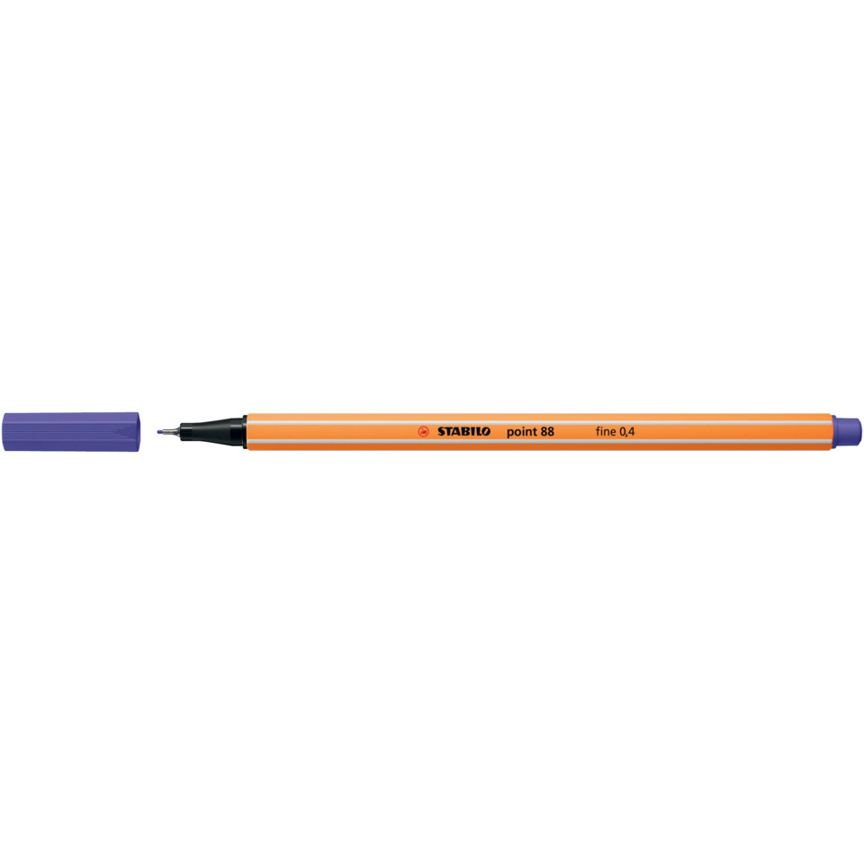 STABILO® point 88®. Der universelle Fineliner für Schüler, Studenten und Profis. Europas Fineliner Nr. 1. Einzigartige Sechskantoptik mit Streifendesign. Typbezeichnung der Mine: Faserspeicher. Ausführung Spitze: metallgefasste Spitze, 0,4 mm, geeignet für Schablone. Art der Schreibflüssigkeit: Tinte auf Wasserbasis, violett, lichtbeständig gegeben. Kann einige Tage offen liegen bleiben, ohne einzutrocknen. Kappe am Stiftende aufsteckbar. Ausführung der Griffzone: Kunststoff. Farbe der Kappe: in Schreibfarbe. Farbe des Schaftes: orange mit weißen Kantenstreifen.