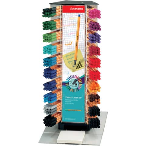 Fineliner STABILO® point 88® Display. 240 Teile. Sortiert in 20 Farben. Sortiments-Zugaben: mit Testblock. Material Display: Kunststoff. Größe (B x T x H): 190 x 270 x 410 mm. Farbe Display: Transparent.