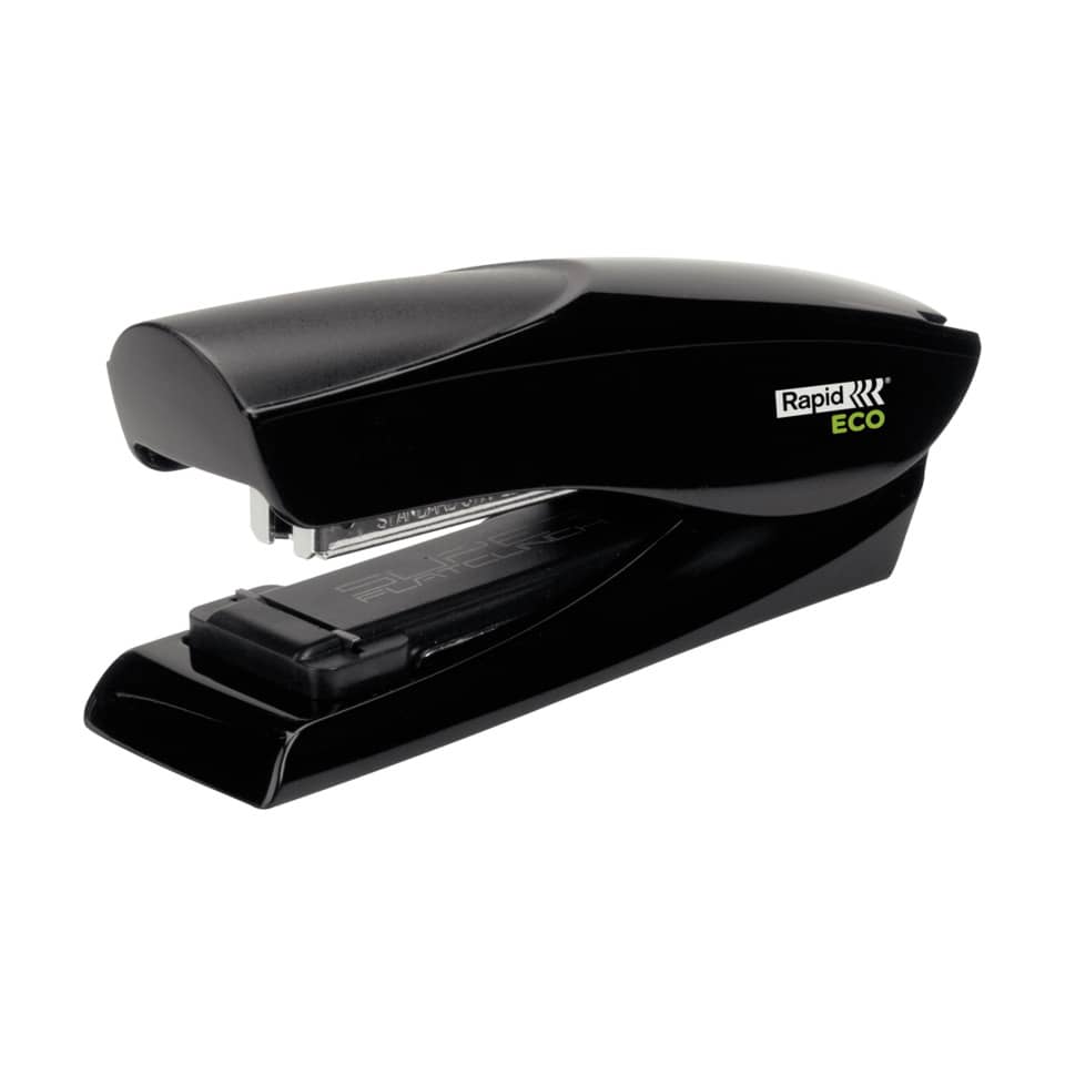 Rapid Flachheftgerät ECO Half Strip, mit patentierter SuperFlatClinch-Technologie für 40% mehr Platz im Ordner dank noch flacher umgelegter Heftklammern. Das Heftgerät ist zu 80 % aus recyceltem Kunststoff hergestellt und lässt sich in seine Einzelteile zerlegen und für Recyclingzwecke getrennt entsorgen. Die Verpackung ist aus recyceltem Karton, mit Klebstoff auf Wasserbasis verleimt und mit erdölfreien Farben auf Soja-Basis bedruckt. Heftklammertyp: 24/6 und 26/6. Heftleistung/Blatt: 2,5mm/25. Einlegetiefe: 55mm. Material: Kunststoff. 5 Jahre Garantie nur bei Verwendung von Rapid Heftklammern. Farbe: schwarz.