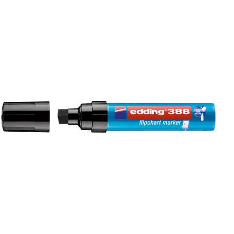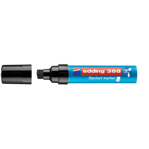 Flipchartmarker edding 388. Geruchsarme Tinte auf Wasserbasis. Kann einige Tage offen liegen bleiben, ohne einzutrocknen. Keilspitze, Spitze austauschbar . Kunststoffschaft. Schaftfarbe: türkis. Strichstärke: 4 - 12 mm. Schreibfarbe: schwarz.