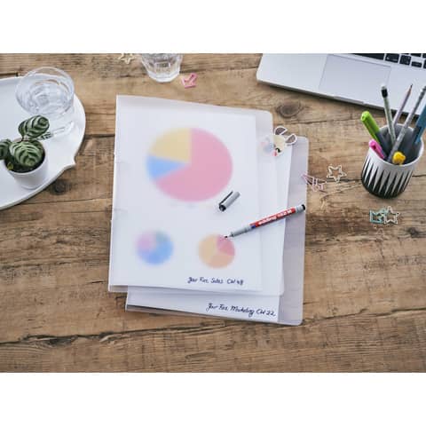 Non-permanenter Folienschreiber zum Schreiben in mittlerer Breite auf fast allen geschlossenen Kunststoffoberflächen. Die Beschriftung ist mit Wasser korrigierbar. Die Rundspitze hat eine Strichbreite von 1 mm. Die Tinte des non-permanent Folienschreibers ist wischfest und schnelltrocknend.