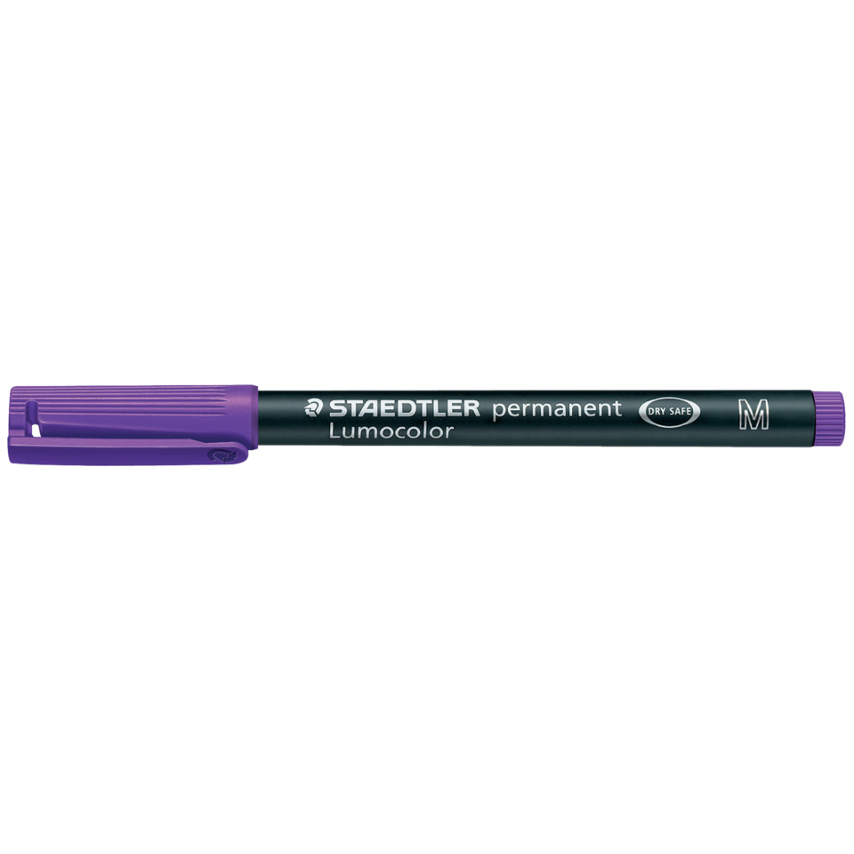 Feinschreiber Lumocolor® permanent Universalstift, Material des Clips: PP-Rezyklat-Kunststoff. Hervorragend wisch- und wasserfest auf fast allen Flächen, Sekundenschnell trocken, daher ideal für Linkshänder,Schaft und Kappe aus 97% aus PP-Rezyklat-Kunststoff garantieren lange Lebensdauer. Ausführung Stift:. nachfüllbar. Typbezeichnung der Mine: Tintenspeicher, Farbe des Schaftes: schwarz, Farbe der Kappe: in Schreibfarbe. Ausführung Spitze: Ausführung der Spitze: Faserspitze (Rund), Strichstärke: ca. 1.0 mm. Ausführung Schreibflüssigkeit: geruchsarme Tinte, xylol- und toluolfrei, wasserfest, kann einige Tage offen liegen bleiben ohne einzutrocknen, Schreibfarbe von Schreibgeräten: violett.