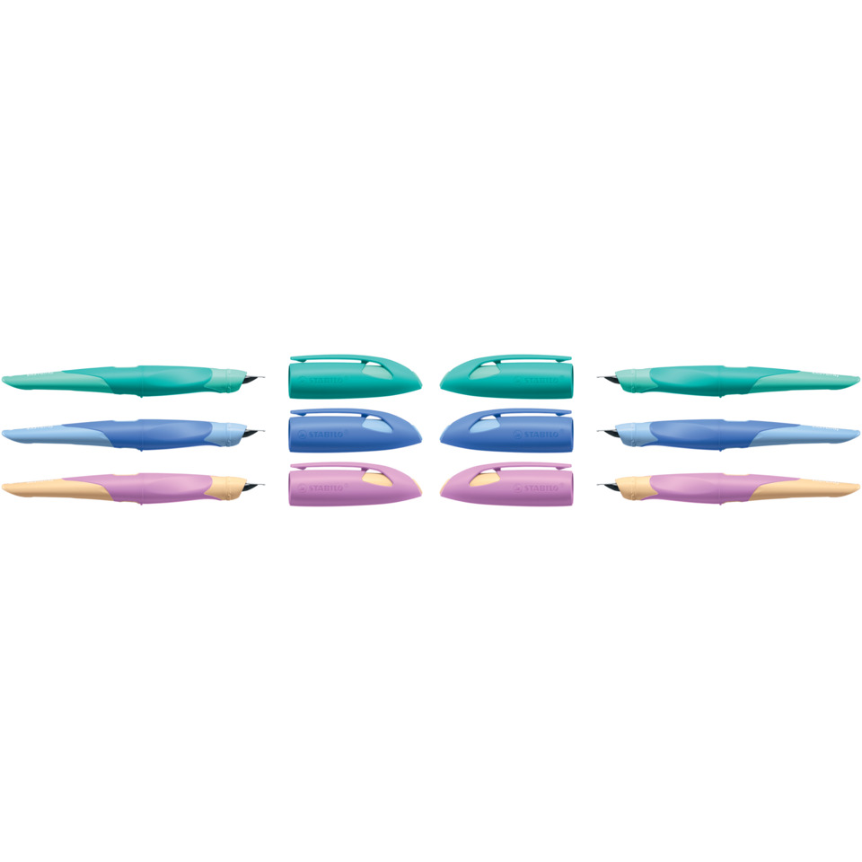 Ergonomischer Schulfüller STABILO® EASYbirdy® Pastel Edition Display. Werkstoff: Karton und Kunststoff. in ergonomischem Design - speziell für Links- und Rechtshänder. Feder Anfänger (A) individuell in 3 Winkeln einstellbar - für weiches Schreiben und ein besonderes Schriftbild ohne Klecksen und Kratzen. Entspannte Handhabung. Leichter Federwechsel. Inhalt Display: Ausführung des Inhalts: sortiert in 3 Farben: Linkshänder je 2 ST blau/hellblau, soft pink/apricot, Rechtshänder je 4 ST blau/hellblau, soft pink/apricot, aqua grün/mint. Farbe: rot/weiß. Größe (B x T x H): 96 mm x 148 mm x 250 mm.