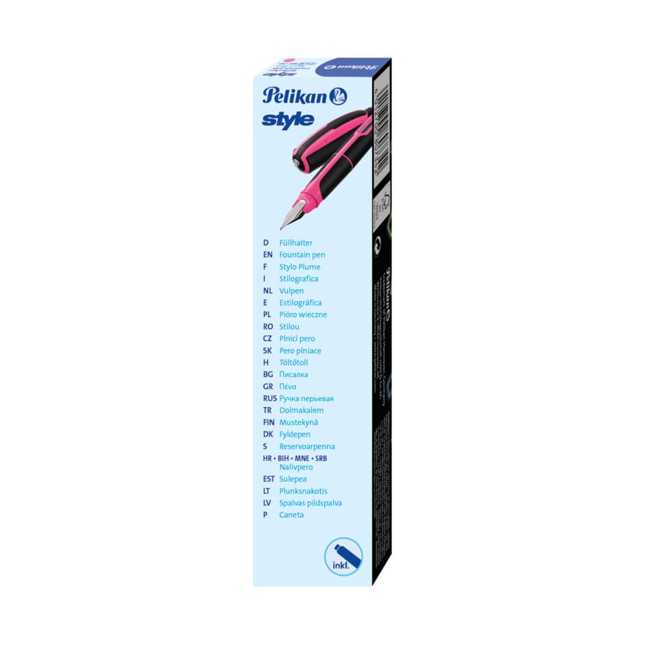 Füllhalter (Patronenfüllsystem) Style Neon Pink. Material der Schreibfeder: Edelstahl. Tintenpatrone: Pelikan 4001, blau. Kolbentankkonverter verwendbar. Material des Schaftes: aus weichem und hartem Material. Ausführung der Griffzone: weiche Griffzone. Clip: Kunststoff, Schwarz/Neon Pink. Ausführung der Feder: M. Farbe des Schaftes: sortiert. Ausführung des Inhalts mit Packung: 1 Stück in Faltschachtel.