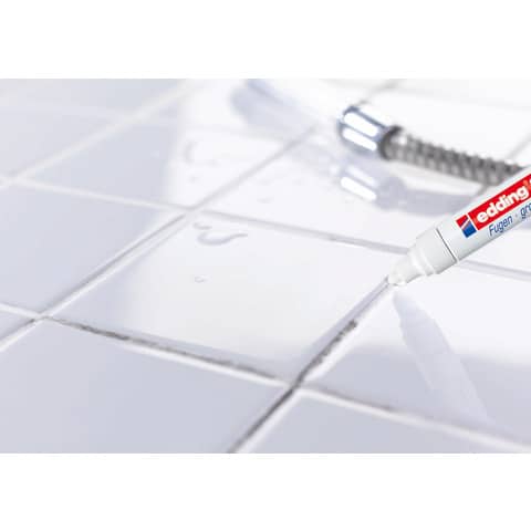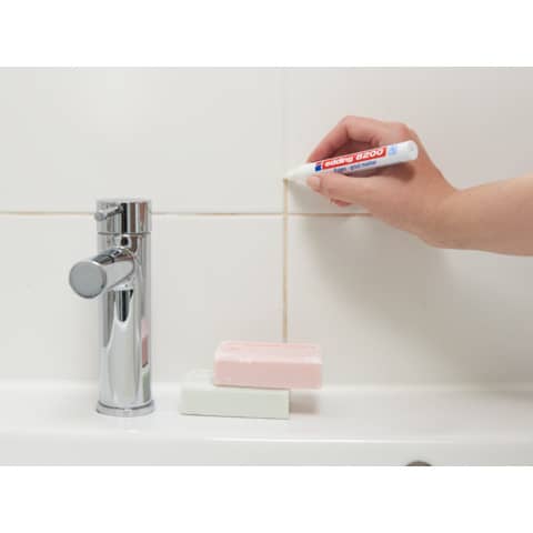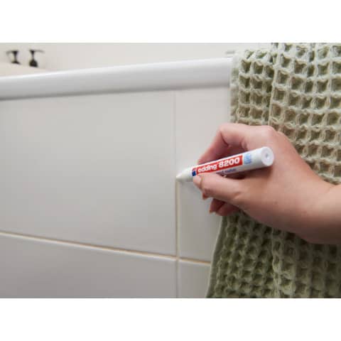 Spezialmarker edding 8200 Fugenmarker. Lackmarker zur farblichen Ausbesserung von Sanitärfugen, z.B. in Bad und Küche. Geruchslose Tinte ohne Zusatz von Xylol/ Toluol. Extrem wasserfeste, stark deckende Tinte, lichtbeständig und schnell trocknend. Pigmenttinte auf Wasserbasis. Rundspitze. Kunststoffschaft und Kunststoffkappe in Schreibfarbe. Strichstärke: 2 - 4 mm. Schreibfarbe: weiß.