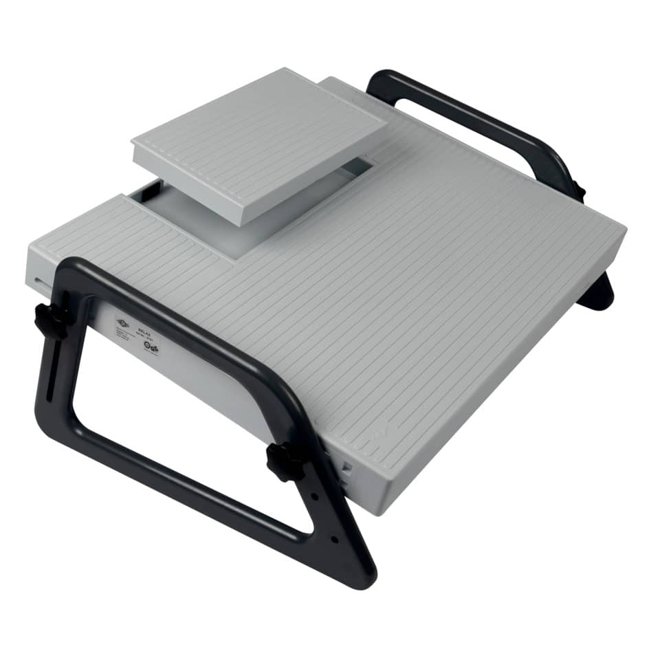 WEDO Fußstütze RELAX lichtgrau (RAL 7035). Aus bruchsicherem Polystyrol mit stufenloser Höhenverstellung. Ausgestattet mit einer Aussparung (22 x 12 x 2 cm) für den Einsatz eines Fußschalters (zB Diktiergerät). Standfest und rutschsicher durch aufgerauhte Trittfläche (45 x 35 cm). Diese Fußstütze entspricht der EU-Richtlinie für Bildschirmarbeitsplätze, der DIN-Norm 4556 und ist GS-geprüft. 3 Jahre Garantie. (Die Fußstütze wird demontiert geliefert). Höhenverstellung vorne von 40 bis 150 mm, hinten von 70 bis 210 mm.