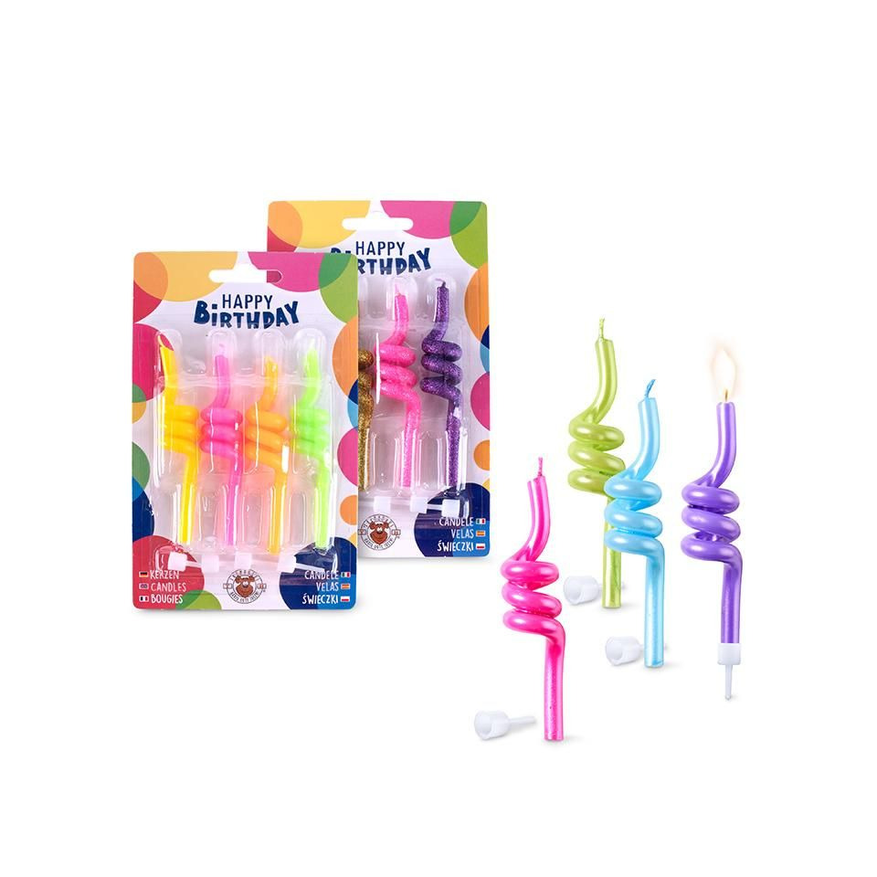 Diese 4 Geburtstagskerzen mitgedrehtem Design inkl. Halterungen verleihen jeder Torte oder Tischdekoration eineelegante Note. Größe: ca.1,5x1,5x10cm. Erhältlich in 3verschiedenen Farbsets: Glitzer,Neon, Metallic