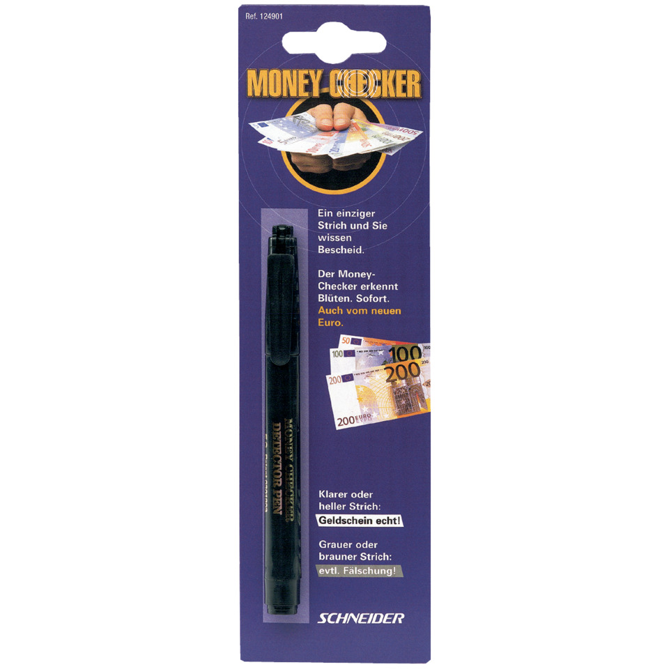 Der Money-Checker erkennt Blüten. Einfach den Geldschein mit dem Money-Checker markieren: klarer oder heller Strich bedeutet „Geldschein echt“, grauer oder brauner Strich bedeutet evtl. „Fälschung“! Er ist für fast alle internationalen Währungen geeignet (bekannte Ausnahmen: kanadische, australische und neuseeländische Dollar). Die Markierung wird auf echten Scheinen nach kurzer Zeit unsichtbar. Wichtig: zur Sicherheit sollte zusätzlich ein Geldschein-Prüfgerät benutzt werden.