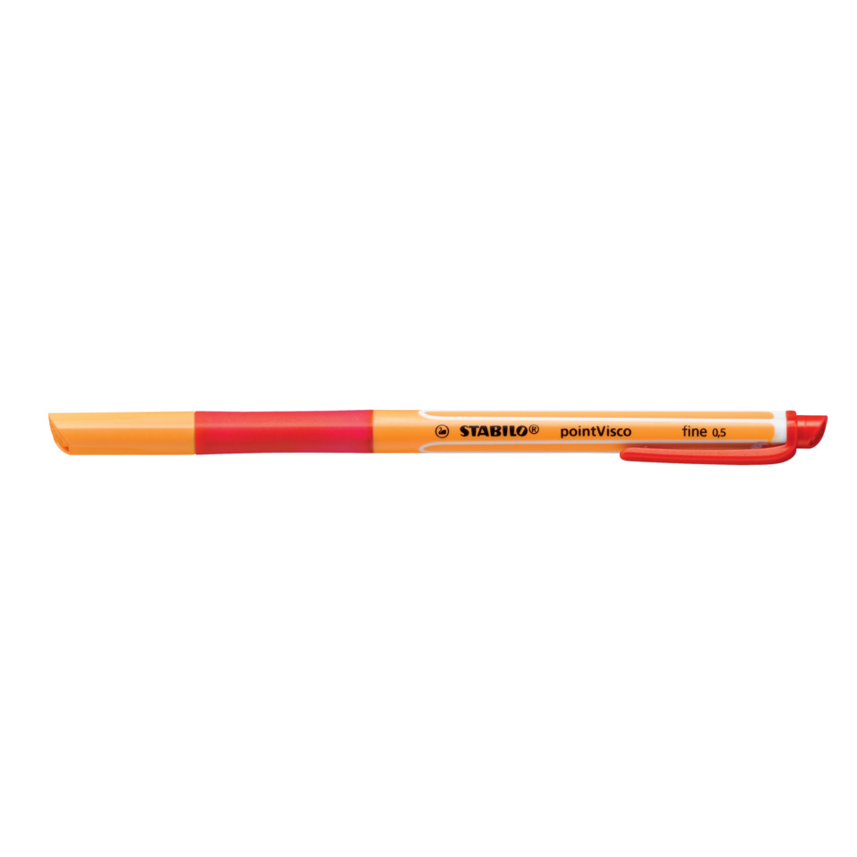 Tintenroller STABILO® pointVisco®, Ausführung der Vorschubmechanik: Kappenmodell, Typbezeichnung der Mine: Rollerballmine, Art der Schreibflüssigkeit: low-viscosity Geltinte, Ausführung Mine: robuste Metallspitze, 0,5 mm, rot, kann einige Tage offen liegen bleiben, ohne einzutrocknen, Tintenspeicher-Technik: Ink Follower, Ausführung Stift: Kunststoff, rutschfest, mit praktischem Clip für unterwegs, Material des Clips: Kunststoff, schmiert nicht, kleckst nicht, trocknet schnell – daher auch besonders für Linkshänder geeignet. Kappe am Stiftende aufsteckbar, Farbe des Schaftes: in Schreibfarbe-orange mit weißen Streifen.