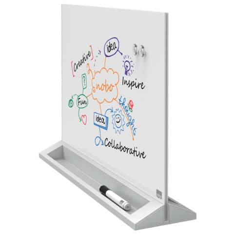 Nobo Glas Desktop-Tafel, magnetisch. Dopppelseitig. Drei Mal leichter zu reinigen durch eine extrem glatte Oberfläche. Überragende Löscheigenschaften. Höchste Widerstandsfähigkeit gegen Farbflecken, Stifteflecken, Kratzer und Dellen. Lieferung inklusive Marker mit Wischer. Reinigung: trocken/feucht. Oberfläche/Material: magnetisch gehärtetes Sicherheitsglas. Rahmen: rahmenlos. Format: 584 x 441 mm. 25 Jahre Garantie. Farbe: weiß.