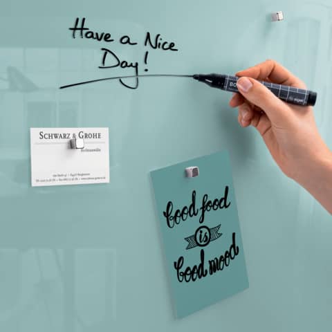 | Verwendungsart der Vorderseite: | beschreibbares Glasboard und magnethaftende Pinnwand in einem |