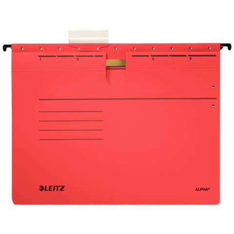 Leitz Hängehefter ALPHA®, für kaufmännische Heftung. Für die geheftete Ablage von Einzelakten. Mit Daumenausschnitt und fest eingezacktem Aufreihband, Hängeschiene mit kunststoffumsinterten Hängenasen, Vollsichtreiter und auswechselbaren Blanko-Schildchen. Material: 100% Pendarec-Karton 275 g/qm (RC). Für A4. Farbe: rot.