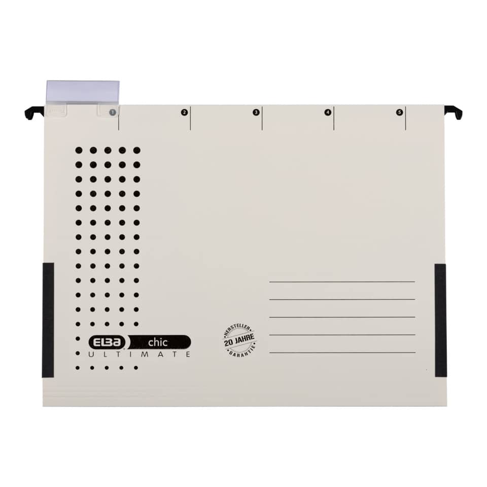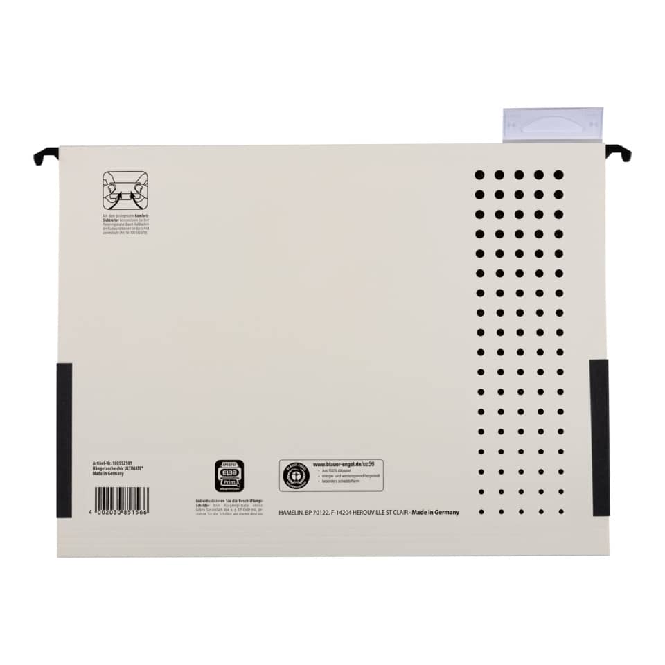 Exklusiver 240g/qm starker Canson® Karton verhindert das Ausreißen des Kartons bei intensivem Gebrauch. Seitlich geschlossen mit Leinenfröschen. Komfortsichtreiter mit aufklappbarer Rückwand und auswechselbarem Beschriftungsschildchen. Schlitzstanzung für Einhängeheftstreifen 27 592. Extrem steife Metallhängeschienen mit pulverbeschichteten Enden. Größe: 318 x 6 x 240 mm (B x T x H). Für ca. 330 Blatt. Beschriftungsmöglichkeit mit ELBA print. Für A4. Umweltzeichen "Der Blaue Engel" und "Paper by Nature".