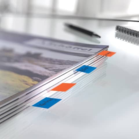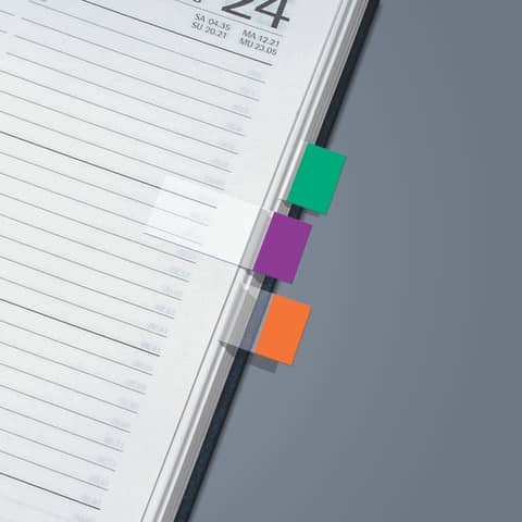 Haftmarker aus Papier mit farbig markiertem Rand in Mint, Orange, Violett und Türkis. Die transparenten Marker sind beschriftbar, rückstandsfrei wiederablösbar und umweltfreundlich durch lösemittelfreien Klebstoff. Im Lieferumfang sind 4x40 Blatt im Format 20x50 mm enthalten.