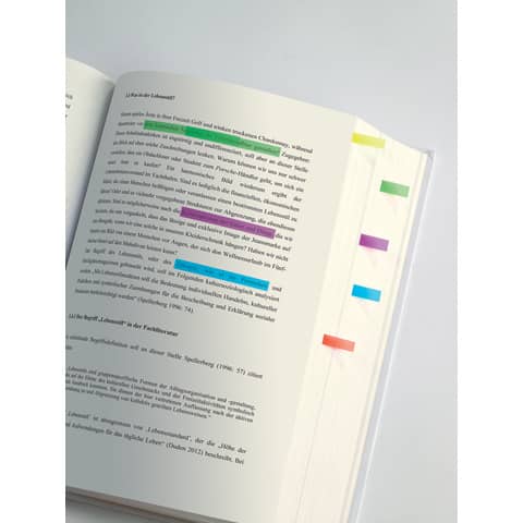 Mix aus reißfesten extra schmalen und mini Haftmarkern aus Folie in den Farben Gelb, Orange, Grün, Violett und Blau. Die transparenten Marker sind beschriftbar, rückstandsfrei wiederablösbar und umweltfreundlich durch lösemittelfreien Klebstoff. Auch geeignet zum Markieren von Text. Im Lieferumfang sind 5x40 Blatt im Format 6x50 mm und 2x40 Blatt im Format 12x50 mm enthalten.