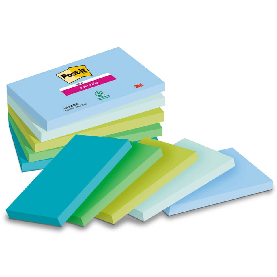 Post-it® Super Sticky Notes Oasis Collection. Ausführung des Papiertyps: PEFC/15-31-0134 zertifiziert. Anzahl der Blätter: 90 Blatt. Größe (B x H): 127 x 76 mm. Farbe: denimblau, mint, limonengrün, immergrün, seeglasgrün. Inhalt der Packung: 5 Blöcke á 90 Blatt.