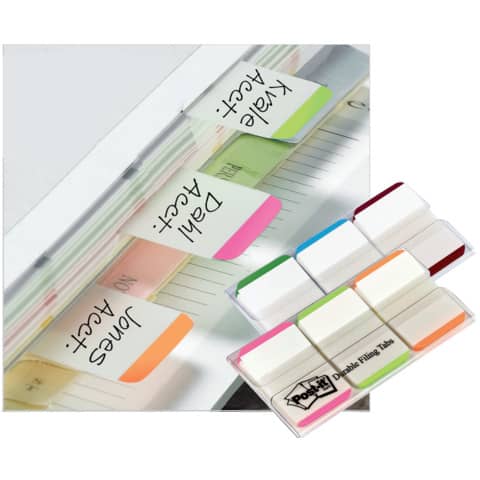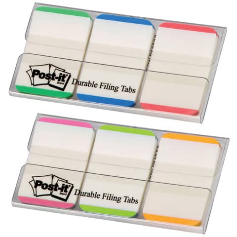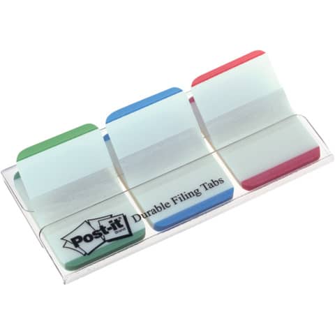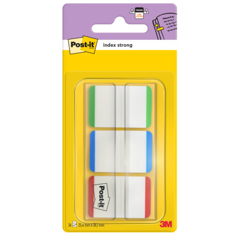 Post-it® Index Strong. Bestens geeignet für die langfristige Archivierung von Dokumenten, als Farbkodierungssystem oder als Karteireiter. Extrastark für extralange Haltbarkeit. Selbsthaftend, wiederablösbar, signalstark und beschriftbar. Anzahl der Blätter: 66 Blatt. Größe (B x H): 25,4 x 38 mm. Typbezeichnung des Motivs: farbiger Rand. Farbe: blau, grün, rot. Ausführung des Inhalts des Sets: 1 transparentes Etui, 3x 22 Haftstreifen mit farbigem Rand (blau, grün, rot).