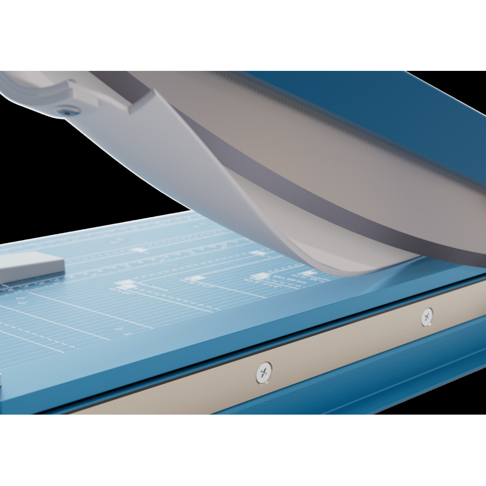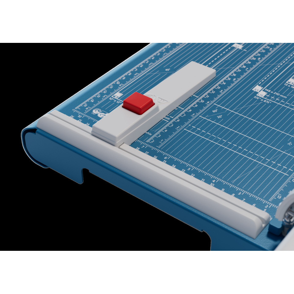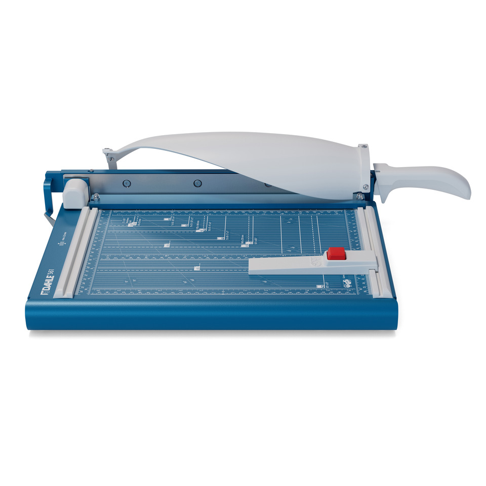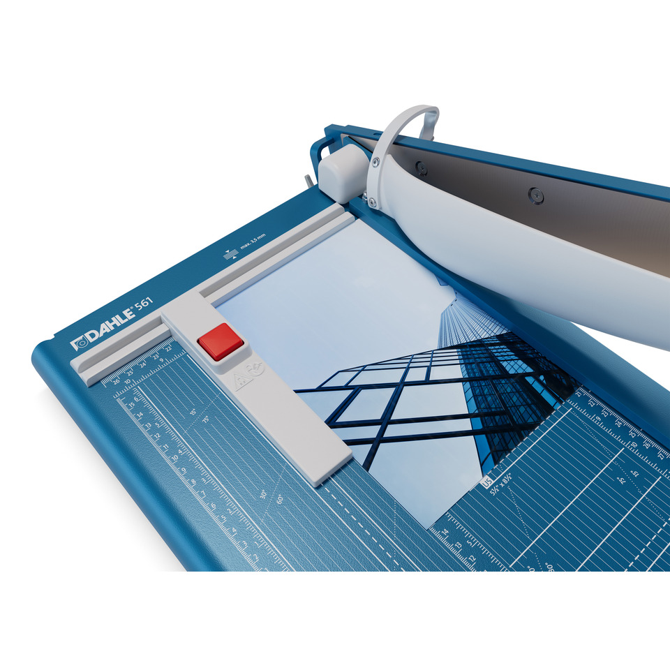 Hebel-Schneidemaschine Dahle 561. Ausführung der Sicherheitsausstattung: Sicherheitsautomatik. Art der Betätigung der Pressung: automatische Pressung. Ausstattung: Rückanschlag verstellbar, Raster mit Formatgrößen vorhanden. Max. Papierformat: DIN A4 = 21,0 cm x 29,7 cm. Geschliffenes Ober- und Untermesser aus Solinger Messerstahl. Masse (Gewicht): 6,1 kg. Farbe: Blau. Material des Tisches: Metall. Tischgröße (B x T): 265 x 440 mm. Länge des Schnittes: 360 mm. Max. Stärke des Stapels je Schnittarbeitsgang: 3,5 mm. Max. Anzahl der Blätter (70g/qm) je Schneidearbeitsgang: 35 Blatt. Max. Anzahl der Blätter (80g/qm) je Schneidearbeitsgang: 28 Blatt.