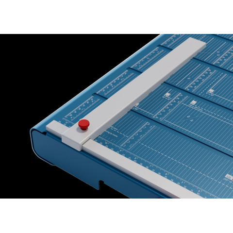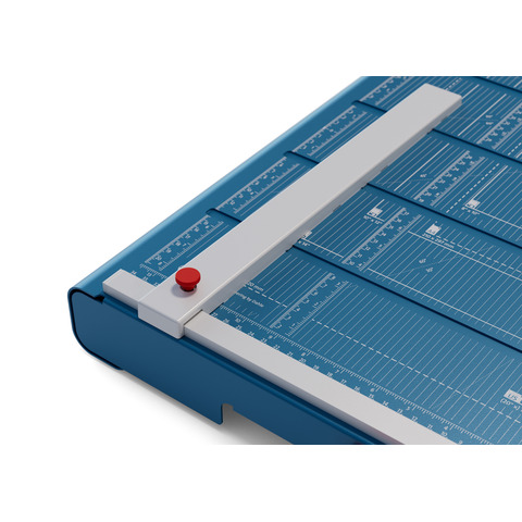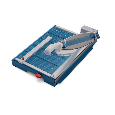 Hebel-Schneidemaschine Dahle 867. Ausführung der Sicherheitsausstattung: Sicherheitsautomatik. Art der Betätigung der Pressung: zu- und abschaltbare Pressung. Ausstattung: Rückanschlag verstellbar, Raster mit Formatgrößen vorhanden. Max. Papierformat: DIN A3 = 29,7 cm x 42,0 cm. Geschliffenes Ober- und Untermesser aus Solinger Messerstahl. Masse (Gewicht): 13,0 kg. Farbe: Blau. Material des Tisches: Metall. Tischgröße (B x T): 365 x 513 mm. Länge des Schnittes: 460 mm. Max. Stärke des Stapels je Schnittarbeitsgang: 3,5 mm. Max. Anzahl der Blätter (70g/qm) je Schneidearbeitsgang: 35 Blatt. Max. Anzahl der Blätter (80g/qm) je Schneidearbeitsgang: 28 Blatt.