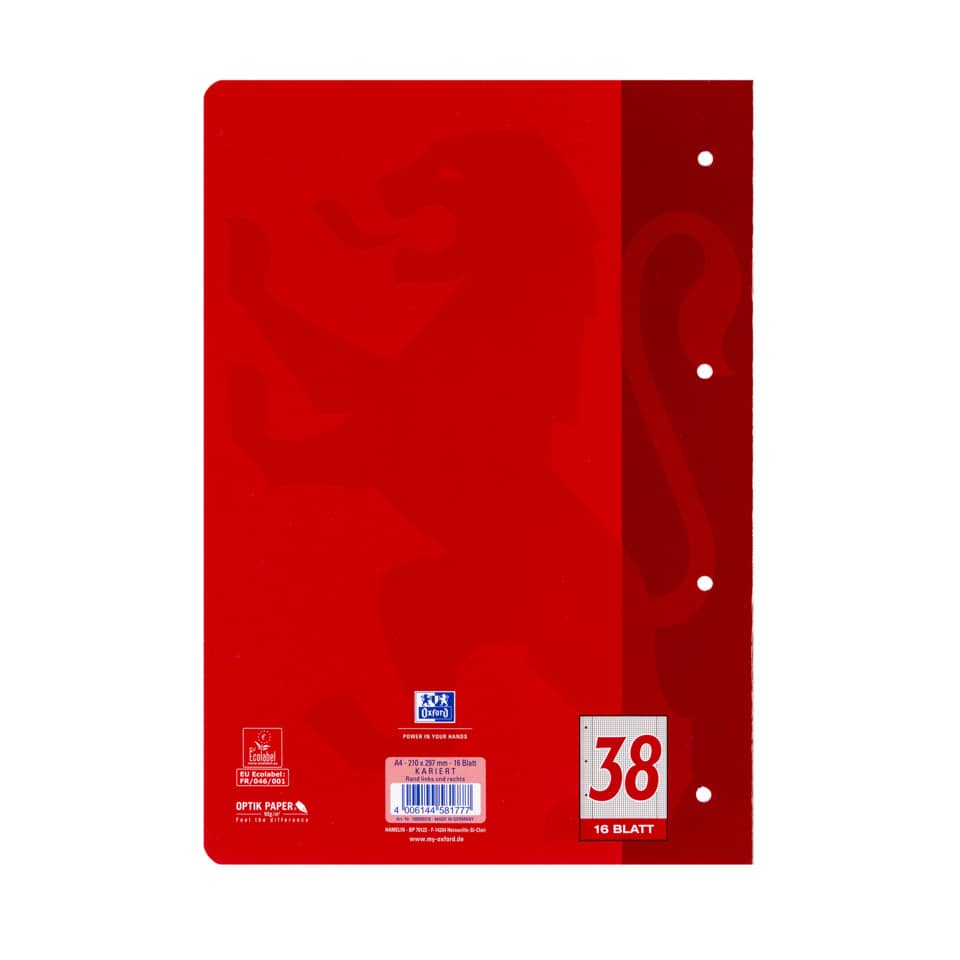 Eigenschaften "Heft, A4, 90g/m², 16 Blatt, Lin.38, kariert mit Rand, rot OXFORD 100050318"