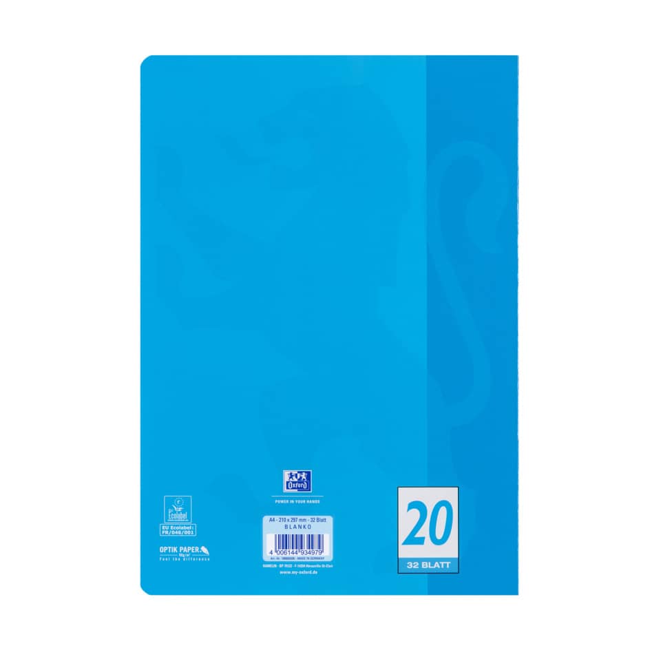 A4 Schulheft, 32 Blatt. OPTIK PAPER® für leichtes Schreiben und optimale Schreibergebnisse. Blanko (Lineatur 20), ideal für Unterrichtsfächer, bei denen Zeichnungen anzufertigen sind. Mit Löschblatt um überschüssige Tinte aufzunehmen. Rückendraht geheftet um alle Seiten optimal beschreiben zu können. Durch umweltverträgliche Herstellung & Produktgüte ausgezeichnet mit dem anerkannten EU - Ecolabel.