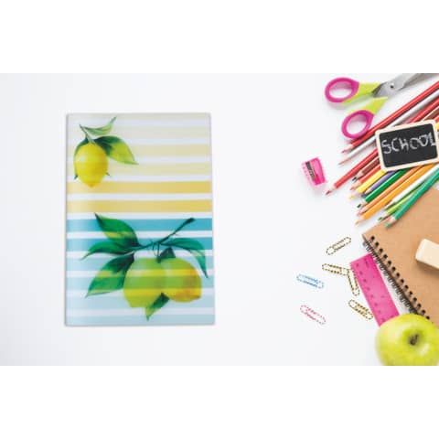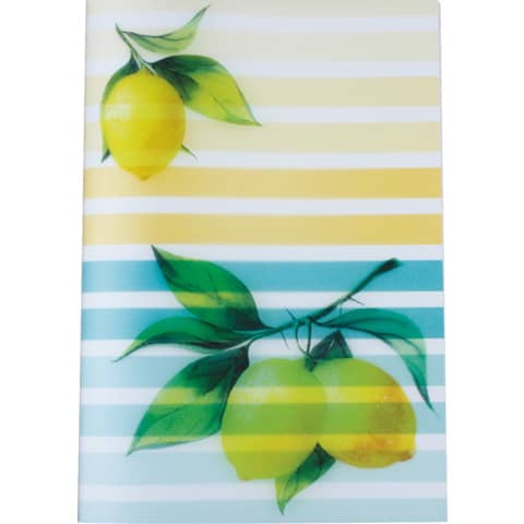 Heft "Lemon". Geheftet. Flächenmasse des Papiers: 60 g/qm. Motiv auf dem transparenten PP-Deckel ergänzt sich mit Druck auf 1. Innenseite, Einband aus abwaschbarem PP Umschlag.. Papierformat: DIN A5. Kariert. Farbe: bunt. Anzahl der Blätter: 100 Blatt.