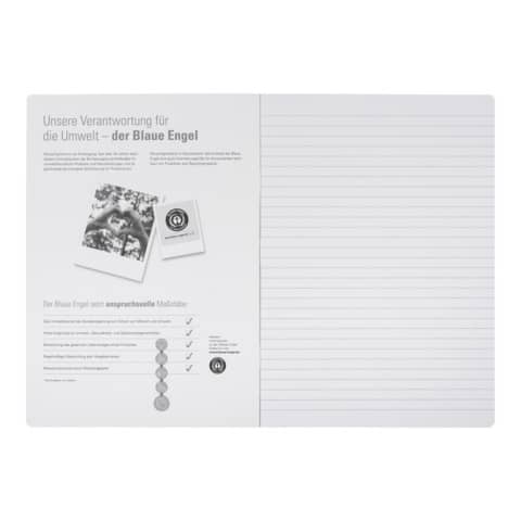 OPTIK PAPER® 100% recycled für leichtes Schreiben und optimale Schreibergebnisse. A4 Schreibheft, 16 Blatt. Liniert ohne Rand (Lineatur 21) für eine Nutzung der ganzen Seite. Extra robuster Umschlag für dauerhaft optimale Nutzung. Mit Löschblatt, um überschüssige Tinte aufzunehmen. Umweltverträgliche Herstellung & Produktgüte ausgezeichnet mit dem Blauen Engel. Rückendraht geheftet, um alle Seiten optimal beschreiben zu können.