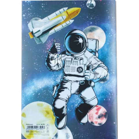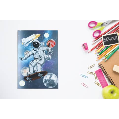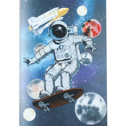 Heft "Skatonaut". Geheftet. Flächenmasse des Papiers: 60 g/qm. Motiv auf dem transparenten PP-Deckel ergänzt sich mit Druck auf 1. Innenseite, Einband aus abwaschbarem PP Umschlag.. Papierformat: DIN A5. Kariert. Farbe: bunt. Anzahl der Blätter: 100 Blatt.