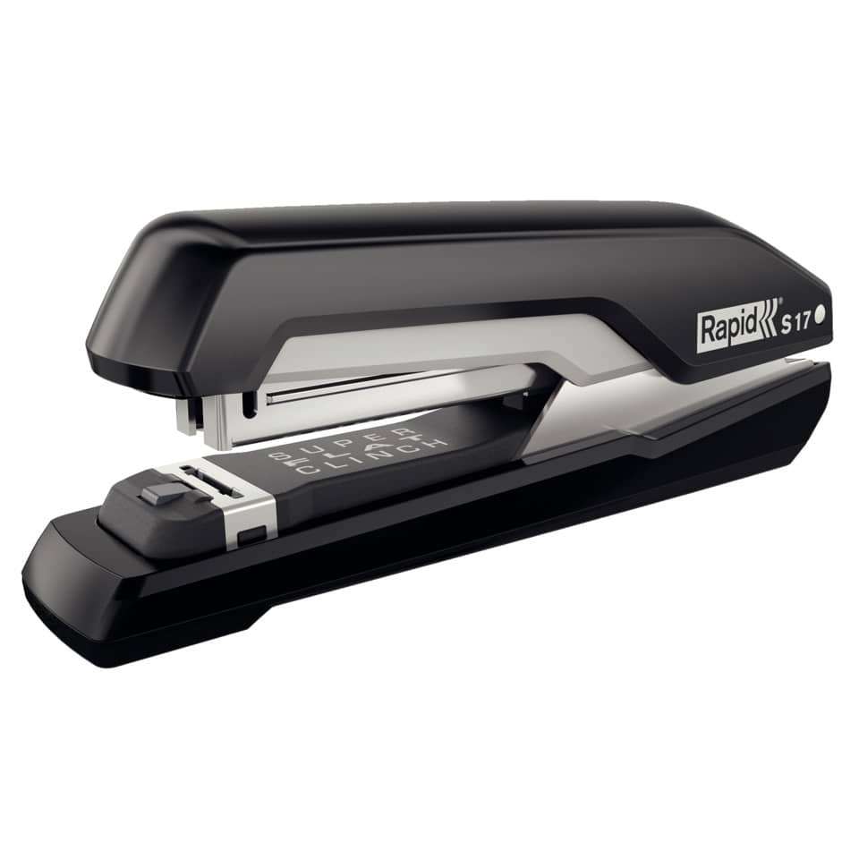 Rapid Heftgerät Supreme S17, mit Oberlademechanik, Fullstrip, mit patentierter SuperFlatClinch-Technologie für 40% mehr Platz im Ordner dank noch flacher umgelegter Heftklammern, rutschfest. Heftklammertyp: 150 x 24/6 oder 210 x 26/6. Heftleistung/Blatt: 3mm/30. Einlegetiefe: 60mm. Material: Metall/ABS. 5 Jahre Garantie nur bei Verwendung von Rapid Heftklammern. Farbe: schwarz/grau.