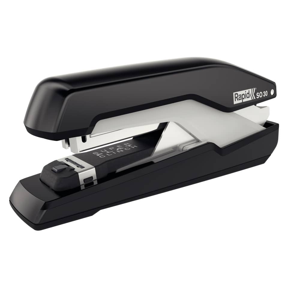 Rapid Heftgerät Supreme SO30, mit Oberlademechanik, Fullstrip, mit patentierter Omnipress-Technologie für 40% Kraftersparnis, patentierter integrierter Hebel für das Heften in der Hand, mit patentierter SuperFlatClinch-Technologie für 40% mehr Platz im Ordner, rutschfest, inklusive Heftklammern Omnipress 30. Heftklammertyp: 210 x Omnipress 30. Heftleistung/Blatt: 3mm/30. Einlegetiefe: 40mm. Material: Metall/ABS. 5 Jahre Garantie nur bei Verwendung von Rapid Heftklammern. Farbe: schwarz/grau.
