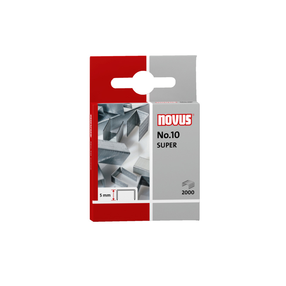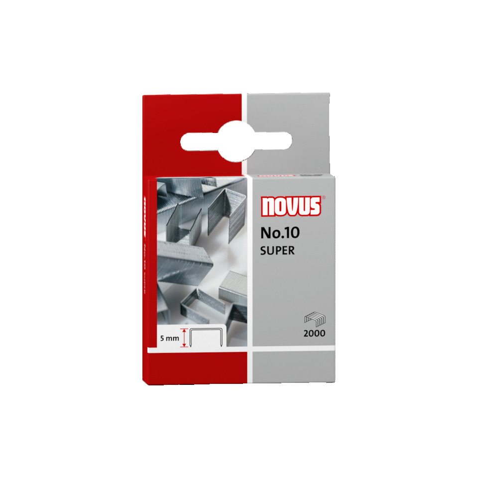 Heftklammer NOVUS No.10 SUPER. Produktverwendung: Für Tischheftgeräte/ Heftzangen. Heftklammer für Bürogeräte mit einer Schenkellänge von 5 mm, Für Papierstapel bis 20 Blatt Standardpapier (80 g/qm). Typbezeichnung der Heftklammern: No.10. Material der Klammern: Stahldraht, verzinkt. Ausführung des Inhalts der Packung: 2.000 Heftklammern.