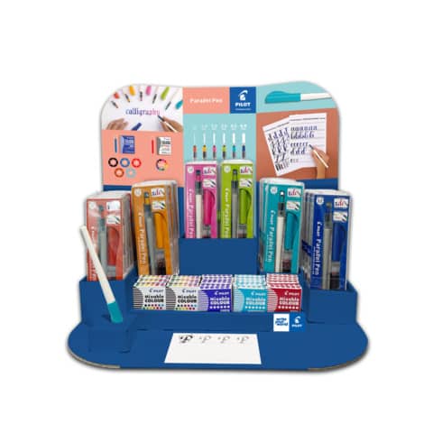 Kalligraphie-Füller Parallel Pen mit Parallel-Platten-System, bestehend aus zwei parallelen lasergeschnittenen Edelstahlspitzen. Für eine schönere und klarere Handschrift als bei herkömmlichen Kalligraphie-Füllern dank besonderer Füllerspitze. Für eine feine oder breite Schrift je nach Anstellwinkel und Druck. Erzeugt auch auf Eck stehend einen zusammenhängenden, feinen Strich. Verfügbar in sechs Strichstärken. Durch Vermischung verschiedener Tintenfarben in der Federspitze fantastische Farbverläufe möglich: Entweder zwei Füllerspitzen senkrecht übereinander halten oder Feder in anders-farbige Tintentropfen halten. Perfekt für Letterings oder Flourishes, egal ob für Profis oder Anfänger! Nachfüllbar mit passender Tintenpatrone (1108) in 12 verschiedenen Farben. Lieferung inkl. Reinigungszubehör sowie zwei Patronen 1108 (Schwarz/Rot). Griffzone und Kappe farblich markiert, um Erkennung der Strichstärke zu vereinfachen. Kappenfarbe Rot: 0,5 - 1,3 mm Strichbreite. Kappenfarbe Gelb: 0,5 - 2,2 mm Strichbreite. Kappenfarbe Pink: 0,5 - 2,8 mm Strichbreite. Kappenfarbe Grün: 0,5 - 3,6 mm Strichbreite. Kappenfarbe Türkis: 0,5 - 4,3 mm Strichbreite. Kappenfarbe Blau: 0,5 - 5,7 mm Strichbreite. 24er Display: je 6x Parallel Pen in allen sechs Strichbreiten sowie 6er Patronensets in den Tintenfarben: je 6x Blau, Rot und Braun, 6x 12er Sets (farblich sortiert). Zusätzlich enthalten: 1x Testblock und 1x Test-Parallel Pen in neuer Strichstärke Türkis (4,5 mm).