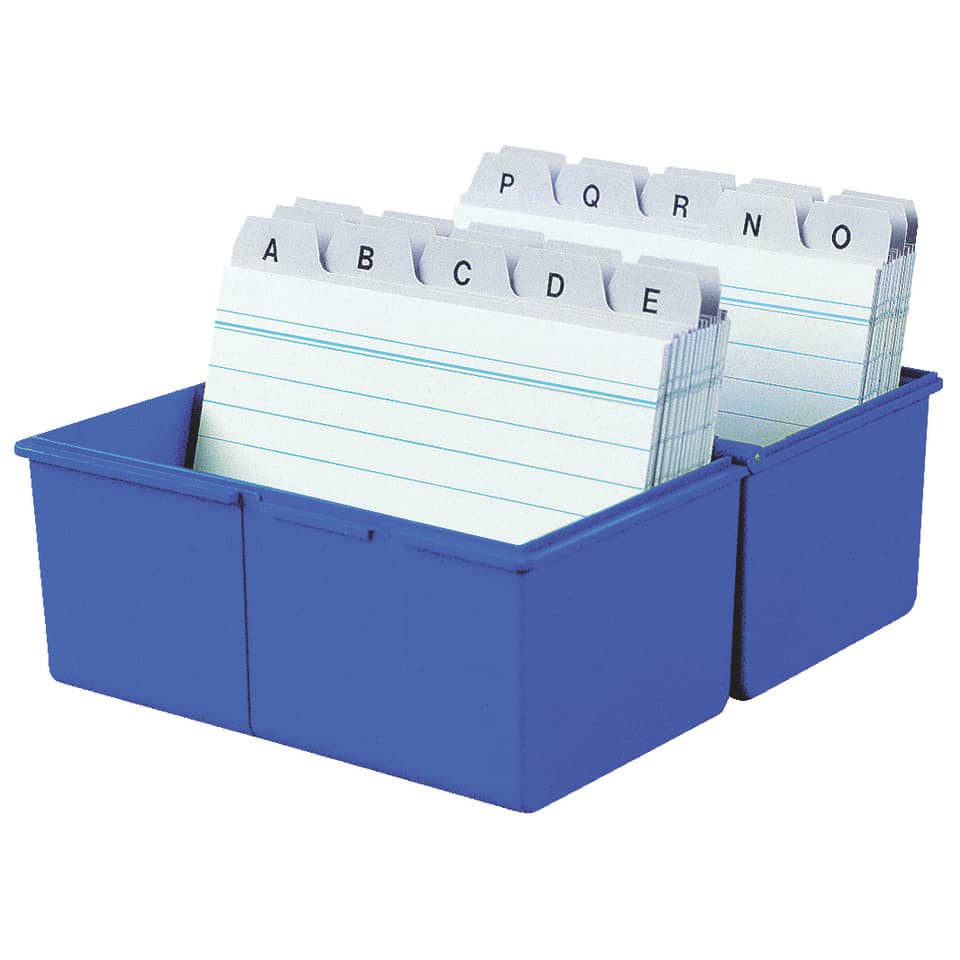Karteibox DIN A6 quer, für max. 400 Karten. Der ideale Ordnungshelfer für Büro und unterwegs. Qualitativ hochwertige Ausführung mit Stahlscharnier sowie Schnappverschluss. Der Deckel lässt sich komplett umklappen und fungiert auch als zusätzlicher Karteitrog. Fassungsvermögen: von 310 Karten (190g/m²) bis max. 400 Karten (100g/m²). Lieferung ohne Inhalt. Verwendung für Kartenformat: DIN A6 quer. Zubehör optional: Register A-Z DIN A6, quer (Art.-Nr. 986). Made in the EU. Außenmaße (B x T x H): 165 x 95 x 128 mm. Material: hochwertiger Kunststoff, Polystyrol (PS). Farbe: blau.