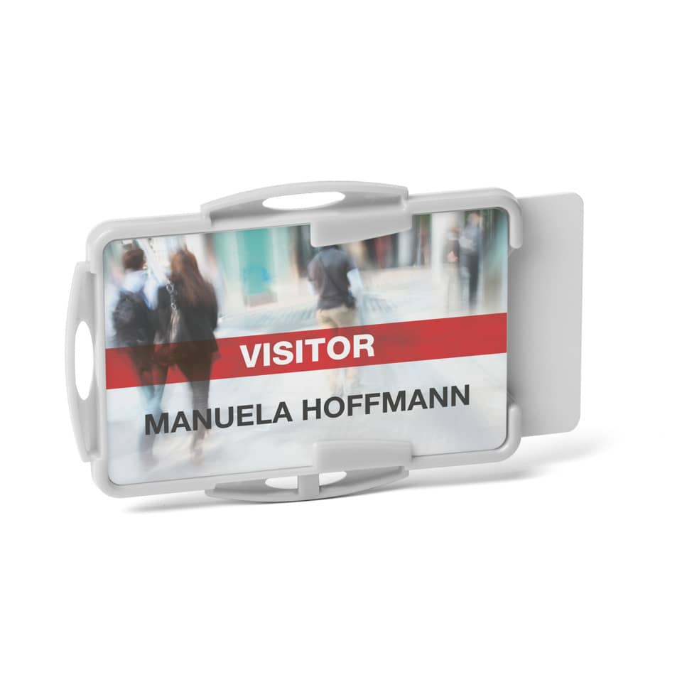 Kartenhalter ECO. Max. Anzahl der Schilder/Hüllen: 2 Stück. Kartenhalter wahlweise im Hoch - oder Querformat nutzbar, mit Clip, Textilband oder Kette kombinierbar. Werkstoff: recycelter Kunststoff in Blauer Engel Qualität. Größe (B x H): 87 x 57 cm. Farbe: grau. Inhalt: 10 Stück.