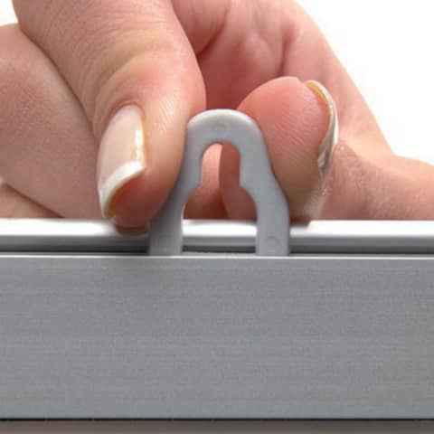 FRANKEN Klemmschiene. Zweiteiliges Set für das Befestigen von Aushängen oder Postern an Wand oder Decke. Die Aushänge werden oben und unten festgehalten. Mit Klemmprofiltechnik für ein einfaches und schnelles Wechseln der Aushänge. Mit 2 verstellbaren Aufhängeösen. Für maximal 50 Blatt. Material: silber eloxiertes Aluminium. Format: 1205 x 26 mm. Farbe: silber.