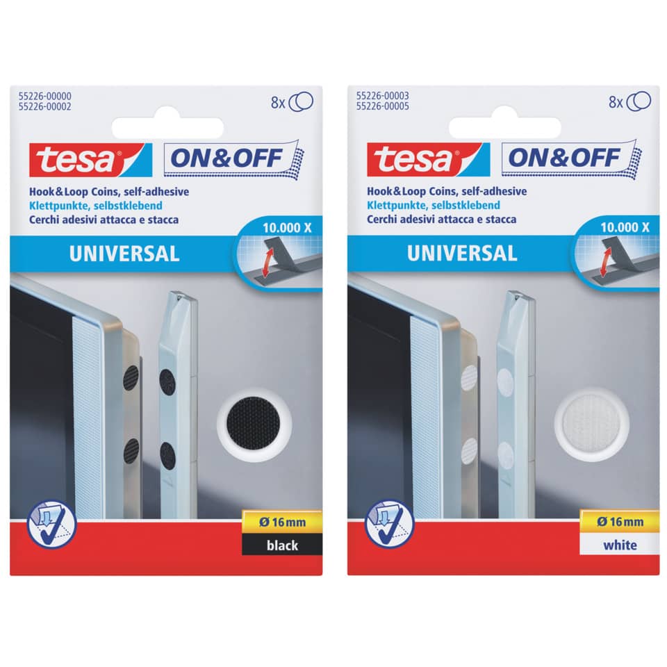 Eigenschaften "Klettpunkte On & Off Universal, Ø16mm, selbstklebend, 8 Stück, weiß TESA 55226-00003-01"