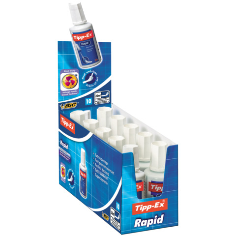 Korrekturfluid Tipp-Ex® Rapid. Ausführung Behälter: Flasche à 25 ml. Farbe: weiß. Art des Auftragungshilfsmittels: Auftragsschwämmchen. Schnelltrocknend, für präzise Korrekturen bei großen Flächen und kleinsten Details, sehr ergiebig.