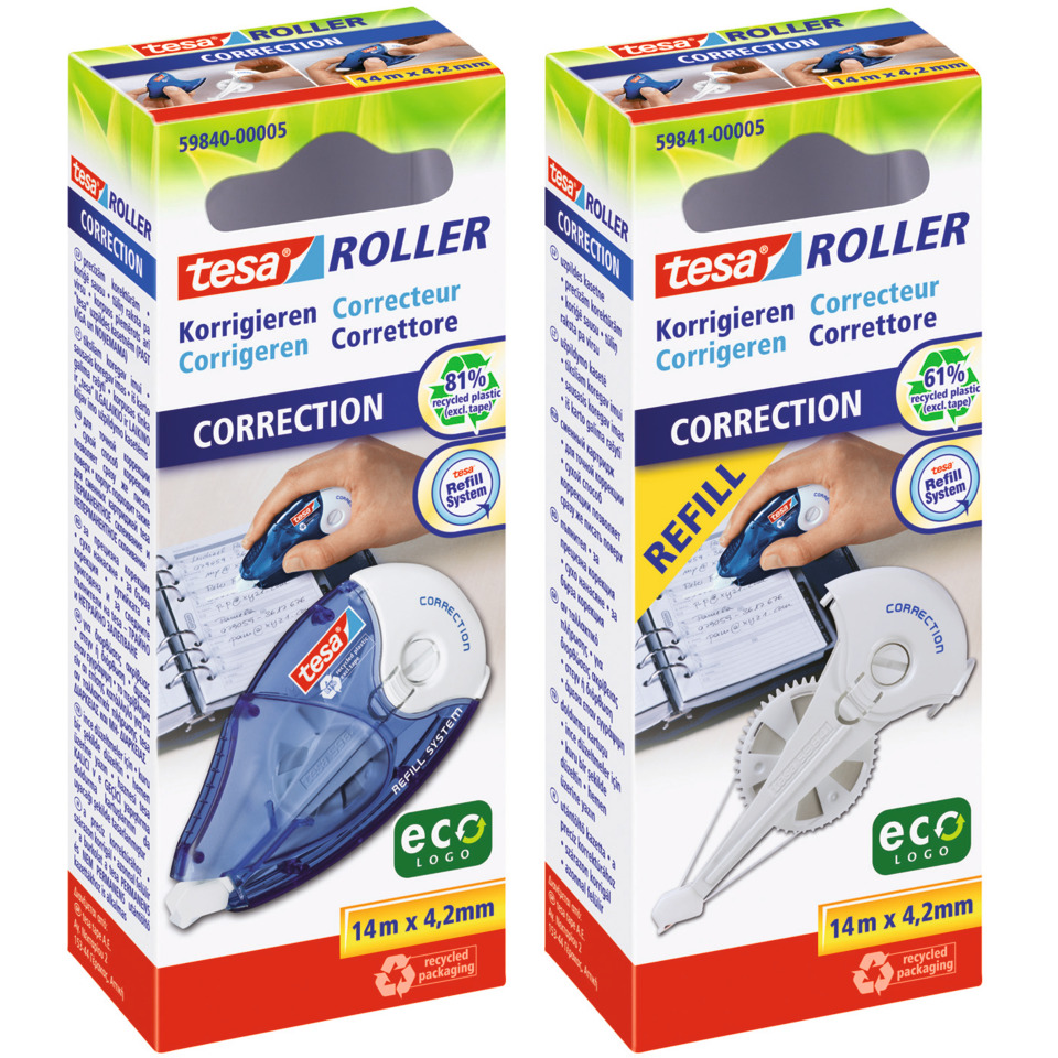 Korrekturroller tesa® Roller Korrigieren ecoLogo Nachfüllroller. Nachfüllbar. Farbe und Ausführung Korrekturband: weiß, ohne Lösungsmittel. Praktisch und Handlich. Größe (B x H x L): 117 x 28 x 49 mm. Gehäusefarbe: blau. Bandgröße (L x B): 14 m x 8,4 mm. Ausführung des Inhalts mit Packung: Nachfüllroller.