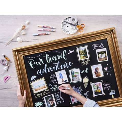 Kreidemarker 4085. Kreidemarker für die nicht-permanente Gestaltung, Dekoration und Beschriftung von geschlossenen Oberflächen, z. B. Fenster, dunkle Tafeln, Glas, plexiglas® und Spiegel. Gut deckende, geruchsneutrale Flüssigkreide auf Wasserbasis. Feucht abwischbar von fast allen geschlossenen Oberflächen. Rundspitze. Weißer Kunststoffschaft mit Kunststoffkappe in Schreibfarbe. Strichstärke: 1 - 2 mm. Schreibfarbe: pastellgelb, pastellgrün, pastellpink, pastellblau.