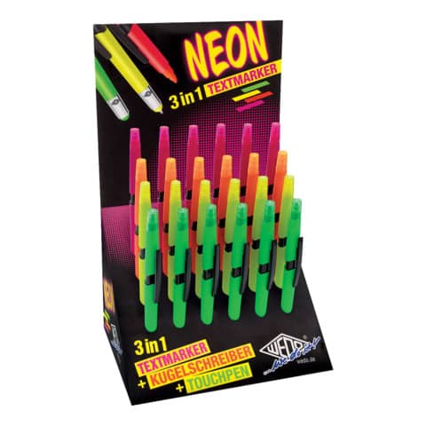 WEDO® 3 in 1: Touchpen, Kugelschreiber und Textmarker. Sehen und gesehen werden – im trendigen Neondesign mit dem 3in1 Kugelschreiber mit Touchpen an der Stiftspitze und Textmarker-Funktion am Stiftende. Der Marker ist entsprechend der Stiftfarbe in Neongelb, Neongrün, Neonpink und Neonorange erhältlich. Die Farbe der nichtauswechselbaren Kugelschreibermine ist blau. Die Touchpen-Funktion finden Sie an der Stiftspitze. Ein stabiler Clip erlaubt die Befestigung an Block oder Mappe. Lieferung im Display (Maße L/B/H 13 x 17,5 x 29 cm) sortiert mit 4 x 6 Farben (24 Stück). Farben: neongelb, neongrün, neonpink und neonorange. Stift-Maße: ca. 14 x 1,7 cm.