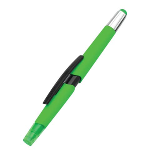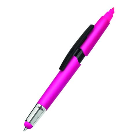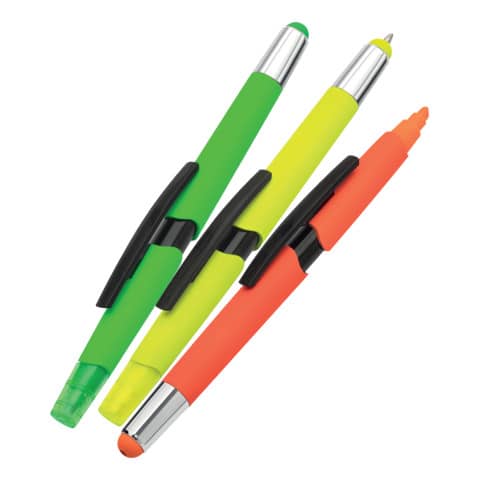 | Besonderheiten: | Kugelschreiber mit Touchpen an der Stiftspitze und Textmarker-Funktion am Stiftende. Der Marker ist entsprechend der Stiftfarbe in Neongelb, Neongrün, Neonpink und Neonorange erhältlich. Kugelschreibermine nicht auswechselbar. |