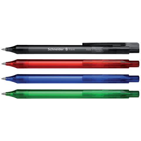 Kugelschreiber Fave. Druckmechanik. Typbezeichnung der Mine: Mine 770. Ausführung Mine: M, blau, dokumentenecht, Mine auswechselbar. Ausführung Stift: Kunststoff. Clip: Kunststoff. Kugelschreiber in frischen Transparentfarben. Ersatzminen Office 765 und Express 775. Schneider Kugelschreiber und Minen mit dem Plug+Play-Symbol sind untereinander kompatibel. Das macht den Minenwechsel spielend einfach. Farbe des Schaftes: sortiert.