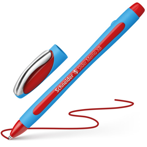 Kugelschreiber Slider Memo XB. Kappenmodell. Typbezeichnung der Mine: neuartige Fluid-Paste. Ausführung Mine: XB, rot. Ausführung Stift: Kunststoff gummiert. Ausführung Clip: Metall, silber. Durch die ViscoGlide®-Technologie gleitet der Slider seidenweich übers Papier. Farbe des Schaftes: cyan-rot.